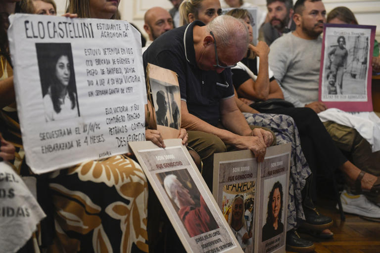 “Genocidas, genocidas”, gritaron los presentes en la sala del tribunal, entre ellos sobrevivientes y familiares de víctimas. Muchos sostenían fotos de los desaparecidos y otros carteles con la frase: “Son 30.000. Fue genocidio”.