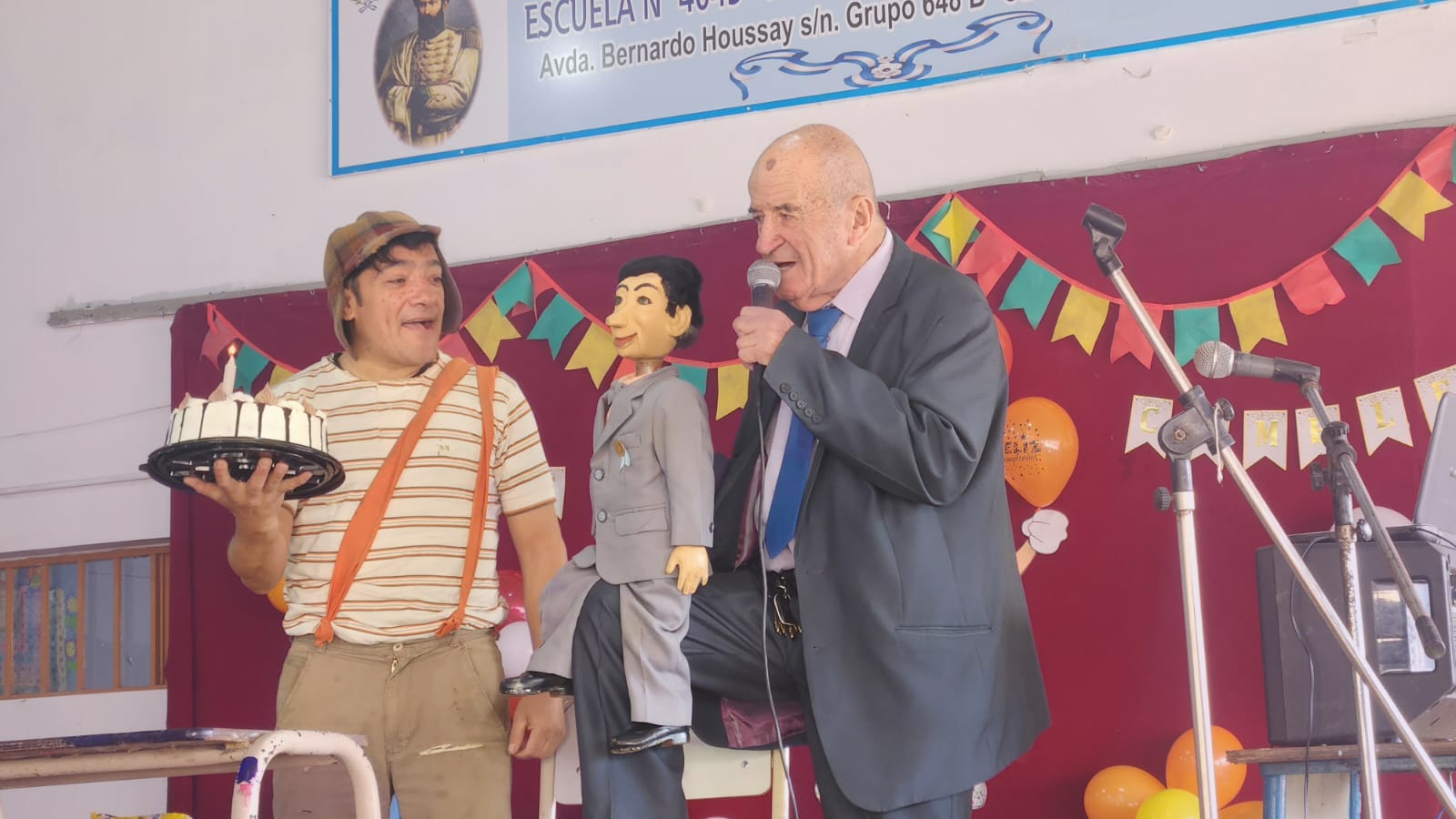 Durante el encuentro en la escuela a la que asisten unos 520 chicas y chicos, Luis Di Stefano habló del festejo y dijo que celebra “con todos los niños y junto al padre de la alegría, Roberto Aredes y su muñeco Pepito, con quien regalamos sonrisas”, al tiempo que agradeció a su “querido amigo Abel Cornejo”, por su participación y los presentes aportados durante el festejo.