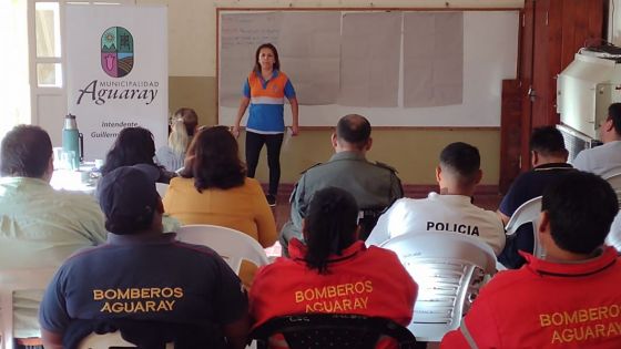 Se conformaron mesas de trabajo con los organismos de primera respuesta ante emergencias en las localidades de General Mosconi y Aguaray. Profesionales de Defensa Civil los asesoraron sobre reducción de riesgos ante contingencias climáticas y protocolos