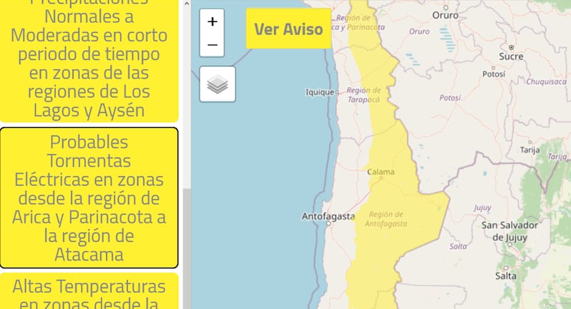 El sistema de alerta de la Dirección Meteorológica de Chile mantenía anoche el anuncio de posibles tormentas eléctricas en zonas de la región de Arica y Parinacota, y también en la región de Atacama. Ese estado de alerta amarilla se mantiene desde el viernes pasado, día en que una fuerte tormenta inundó partes del poblado de San Pedro de Atacama.