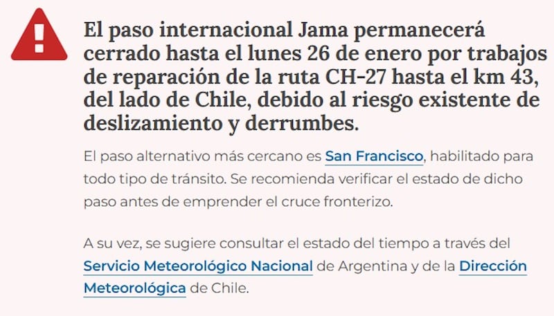 El embajador argentino en Chile, Jorge Faurie, elevó su queja al director Nacional de Fronteras y Limites del Estado chileno, Carlos Dettleff. Argumentó “la gran preocupación, tanto de autoridades nacionales, como de las Provincias argentinas de Salta y Jujuy, por los cierres intempestivos que se vienen produciendo en el Paso de Jama”. El viernes las autoridades de la Dirección de Vialidad trasandina informaron que se habilitaría el paso hoy a las 13 y el gobierno argentino, en el sitio del Ministerio de Seguridad, copió textual la información oficial chilena.