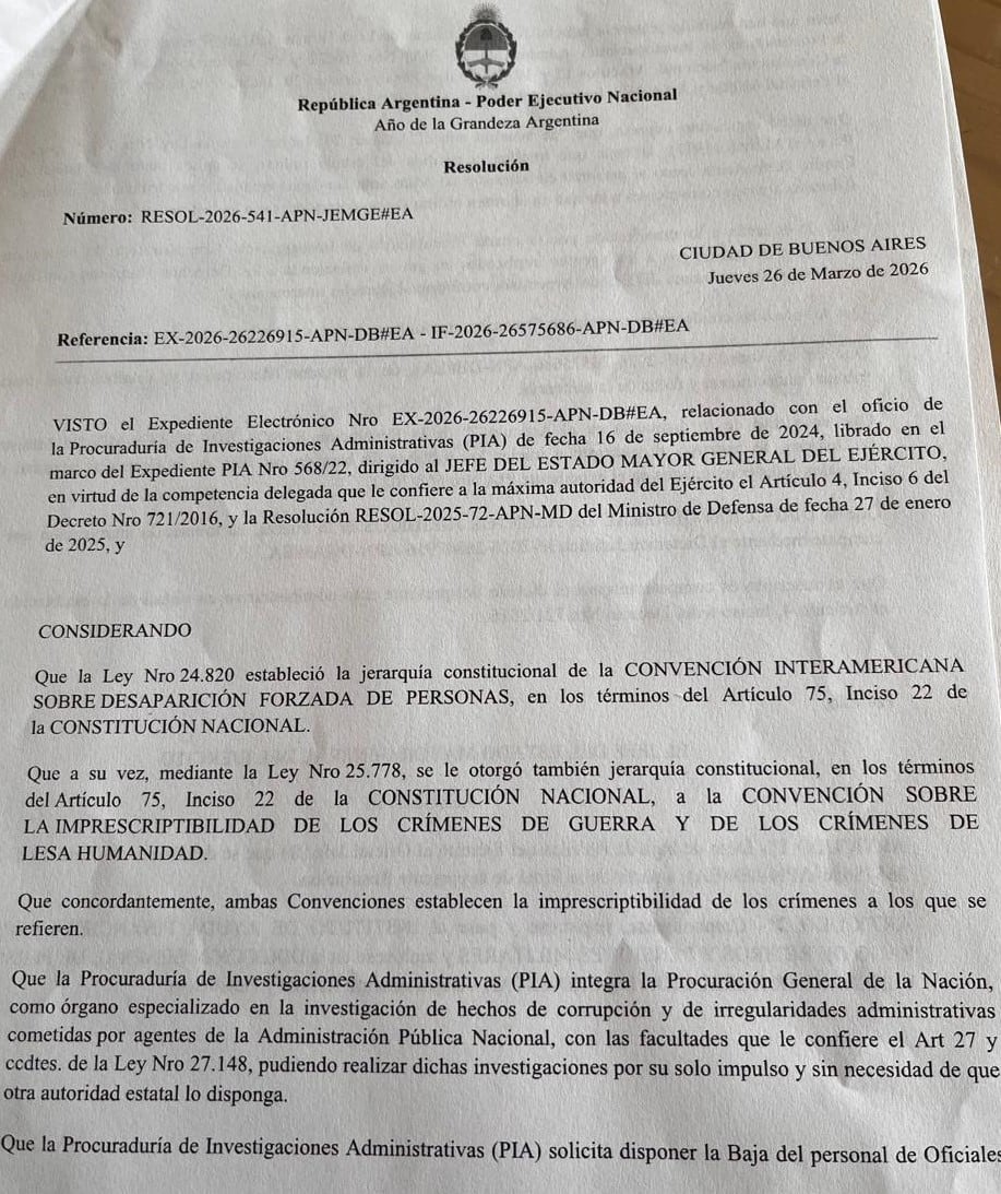 Veinte días después de la primera presentación del grupo liderado por Sandoval, el jefe del Ejército, Oscar Zarich, firmó la baja de 34 militares con condenas firmes, tal como había pedido la Procuraduría de Investigaciones Administrativas (PIA).