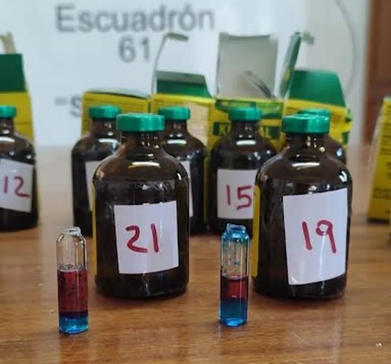 Inmediatamente, los funcionarios interceptaron a los individuos, un ciudadano argentino y otro boliviano (ambos mayores de edad). Luego de interrogarlos, los registraron y comprobaron que llevaban 24 frascos en una caja. De esta manera, personal de Criminalística y Estudios Forenses de la fuerza realizó las pruebas de campo “Narcotest” sobre el contenido de los recipientes, que dieron resultado positivo para Ketamina, con un total de 1.200 ml (50 ml por frasco).