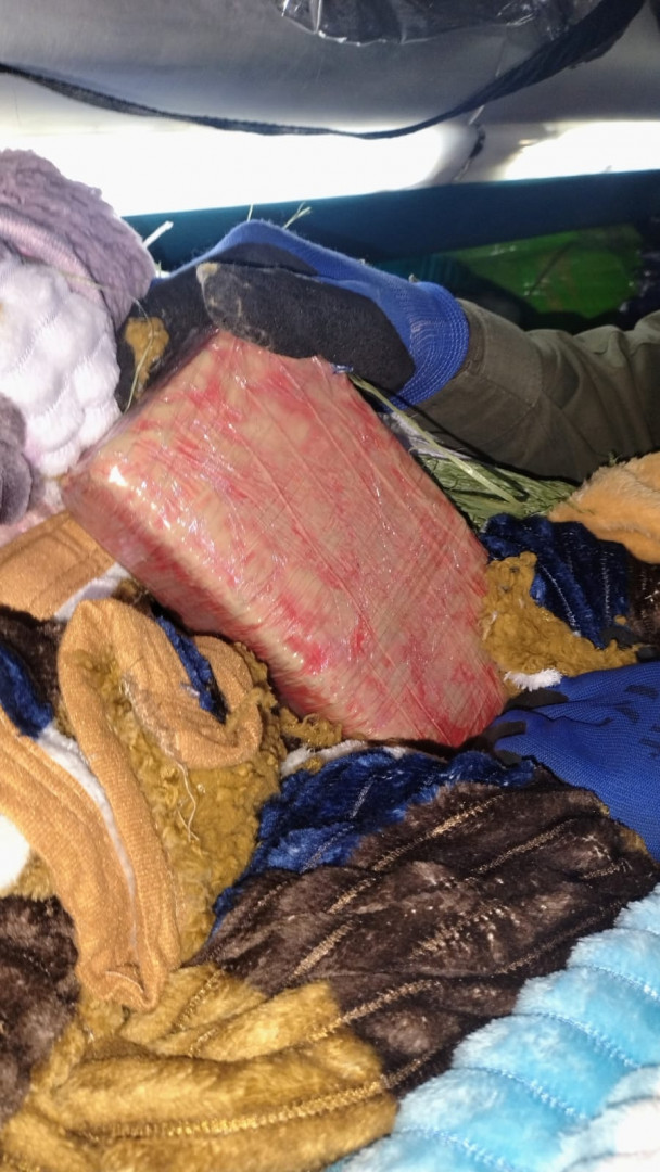 Al realizar una requisa más exhaustiva, sacaron de una de las mantas ocho paquetes "embadurnados en grasa de motor y recubiertos con film de nylon transparente". Desde Gendarmería confirmaron que así son los paquetes "utilizados para el transporte de estupefacientes".