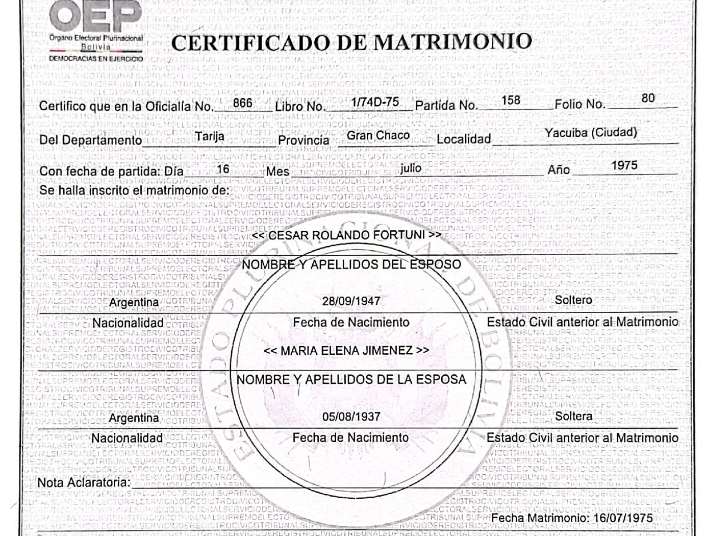 Sin embargo, el 16 de julio de 1975, Jiménez se había casado con César Fortuny en Bolivia, en la ciudad de Yacuiba, el 16 de julio de 1975, según el certificado de matrimonio 128425, en el que se hizo constar que la escribana tenía el estado civil de “soltera”.