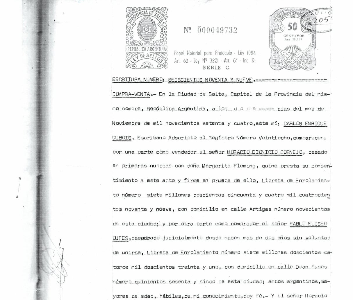 El 23 de noviembre de 1982, Jiménez vendió la Finca Lagunita o Madeta, ubicada en San José de Orquera, en el departamento Metán, que era de propiedad de Pablo Eliseo Outes, quien la había adquirido cuando ya estaba divorciado legalmente de la escribana, como se aclara en la escritura de compraventa suscripta el 12 de noviembre de 1974. “Separado judicialmente desde hacen más de dos años sin voluntad de unirse”, dice la escritura.
