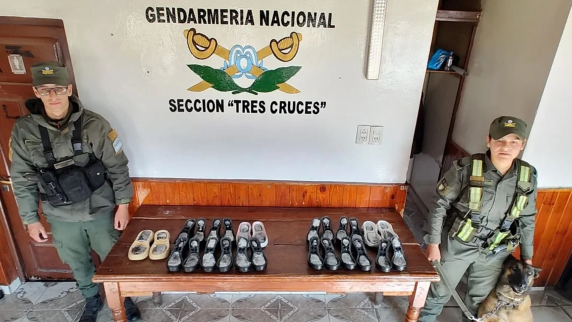 Mientras se llevaba a cabo ese procedimiento, arribó al control otro transporte de pasajeros en el que la can vuelve a reaccionar de la misma manera pero esta vez sobre un bolso de color celeste perteneciente a otro ciudadano de nacionalidad boliviana. Inmediatamente, en presencia de testigos, los gendarmes detectaron siete pares de zapatillas bajo el mismo modus operandi poseían dos envoltorios dentro de esa especie de doble fondo en la suela.