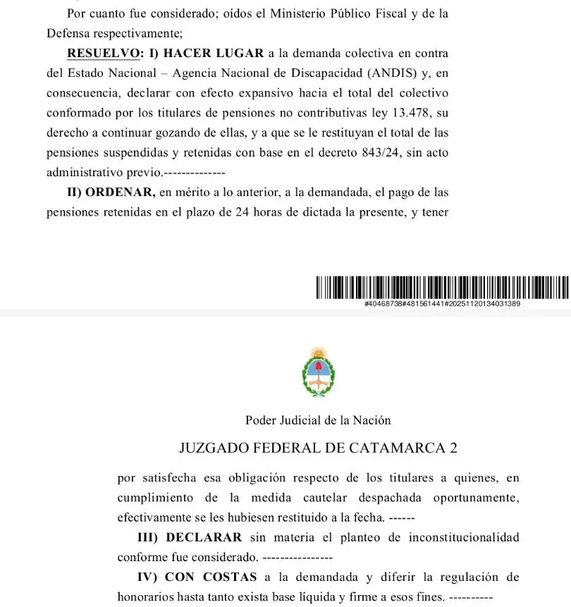"Hacer extensivo a todo el territorio nacional la medida cautelar dictada el 12 de setiembre de 2025 y en consecuencia ordenar a la Agencia Nacional de Discapacidad (ANDIS) que, en el plazo de veinticuatro horas (24h)… restablezca la totalidad de las pensiones suspendidas y/o retenidas…, pague el importe de los haberes de pensión retenidos…; y… se abstenga de continuar las auditorías con base en la normativa cuestionada… y de disponer nuevas suspensiones de pensiones no contributivas por incapacidad laboral; II) Conferir la representación adecuada del frente actor… a la Asociación de Personas y Familiares de Discapacitados Motores y a la Asociación Azul; […]”, argumenta el fallo del juzgado federal 2 de Catamarca. La Justicia estableció 24 horas de plazo.