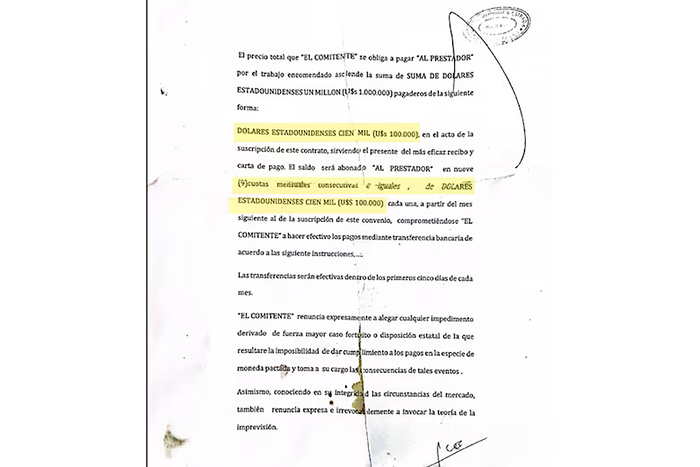 “El precio total que “el comitente” (Machado) se obliga a pagar “al prestador” (Espert) por el trabajo encomendado asciende la suma de suma de dólares estadounidenses (U$s 1.000.000) pagaderos de la siguiente forma: en nueve dólares estadounidenses (U$s 100.000), en el acto de la suscripción de este contrato, sirviendo el presente del más eficaz recibo y carta de pago”, dice el texto.