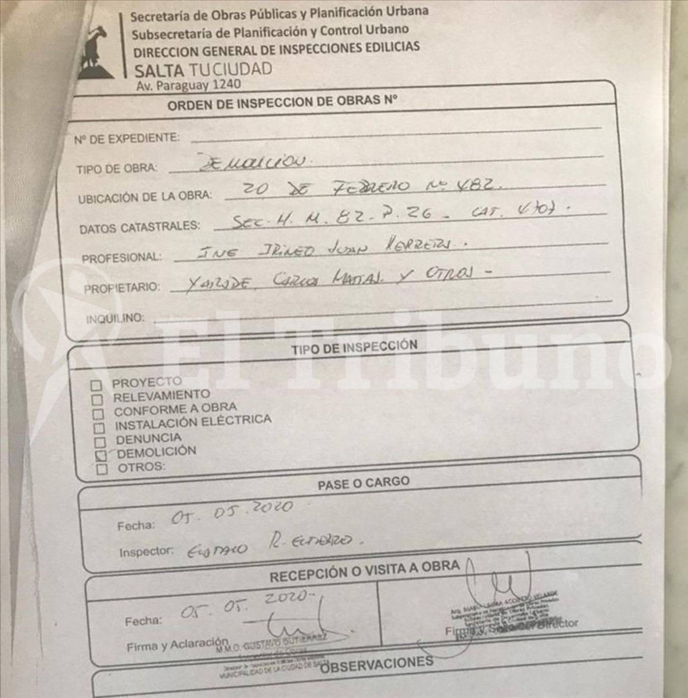 El Tribuno accedió a documentos (orden de inspección del catastro 4.707), que tienen la firma de Accietto Velarde y del inspector Gustavo Gutiérrez. Fuentes municipales remarcaron que Accietto Velarde fue la responsable y quien "firmó" la autorización. Señalaron que la Municipalidad ya había denegado el pedido de demolición hace dos años. Hicieron notar que la arquitecta Sanguedolce no asistía a la Municipalidad por el aislamiento y que no vio el expediente pese a que aparece su firma digital.