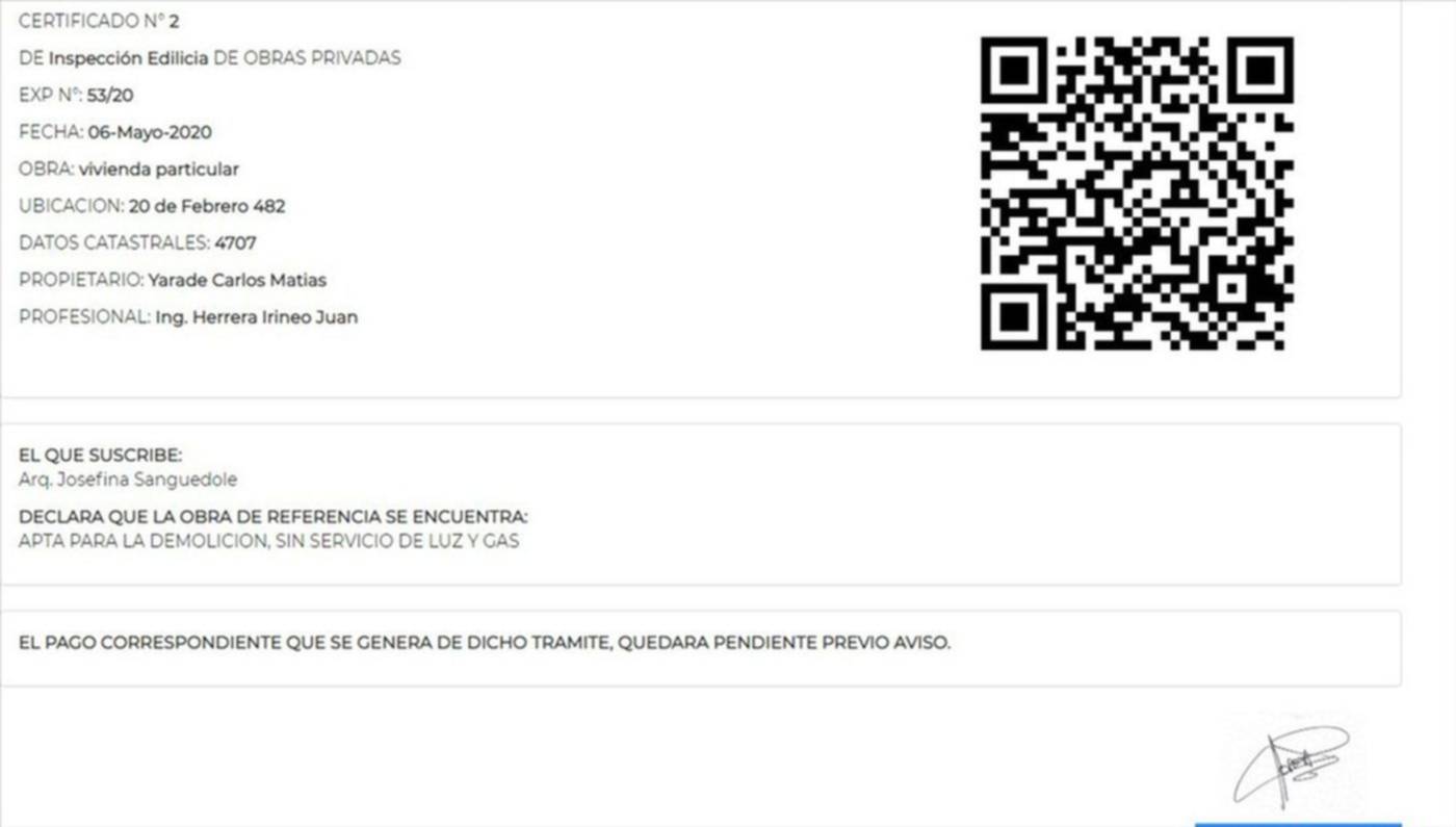 Accietto Velarde, en diálogo con este medio, negó haber otorgado la autorización, y expuso una certificación online en la que aparece el nombre de la arquitecta Josefina "Sanguedole" (el apellido correcto es Sanguedolce). Abajo está la expresión: "declara que la obra de referencia se encuentra apta para la demolición, sin servicio de luz y gas", con fecha del 6 de mayo de este año. "Yo jamás firmé una autorización, no dejaron que acceda al expediente", se quejó Accietto Velarde.