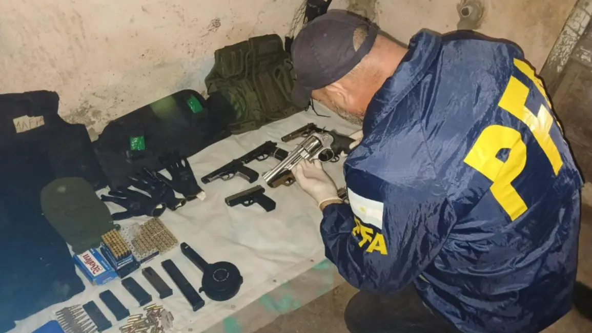 Pero el hallazgo más llamativo ocurrió durante un procedimiento en San Martín, donde los federales descubrieron oculto en una rejilla de desagüe un arsenal integrado por pistolas calibre 9 mm, revólveres .38 Special y .44 Magnum con numeración limada, cargadores y gran cantidad de municiones.