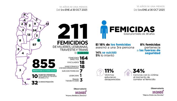 «Los femicidios no bajaron, la crueldad sigue en aumento», espetaron desde el colectivo feminista, subrayando que desde el 1º de enero al 30º de octubre ocurrieron 211 delitos de este tipo, uno cada 34 horas. Por otro lado, remarcaron que hubo 855 intentos de femicidios en todo el país.