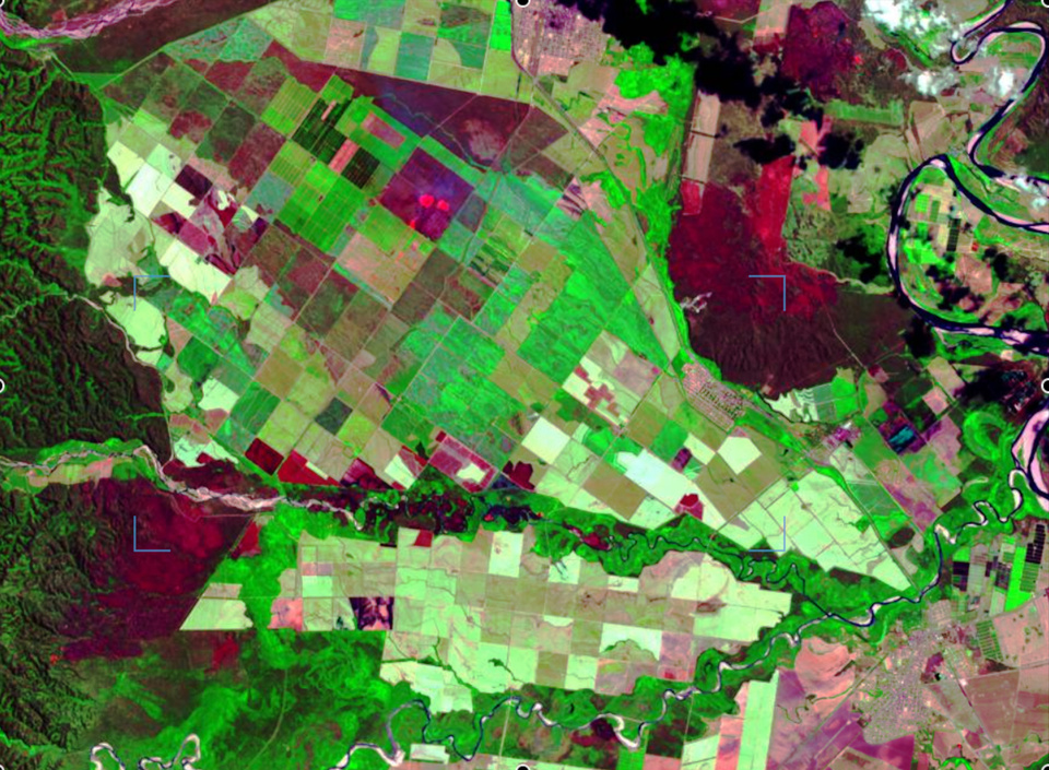 En violeta, las áreas quemadas entre San Ramón de la Nueva Orán (arriba) y Colonia Santa Rosa (abajo) (Imagen: gentileza Land Viewer)