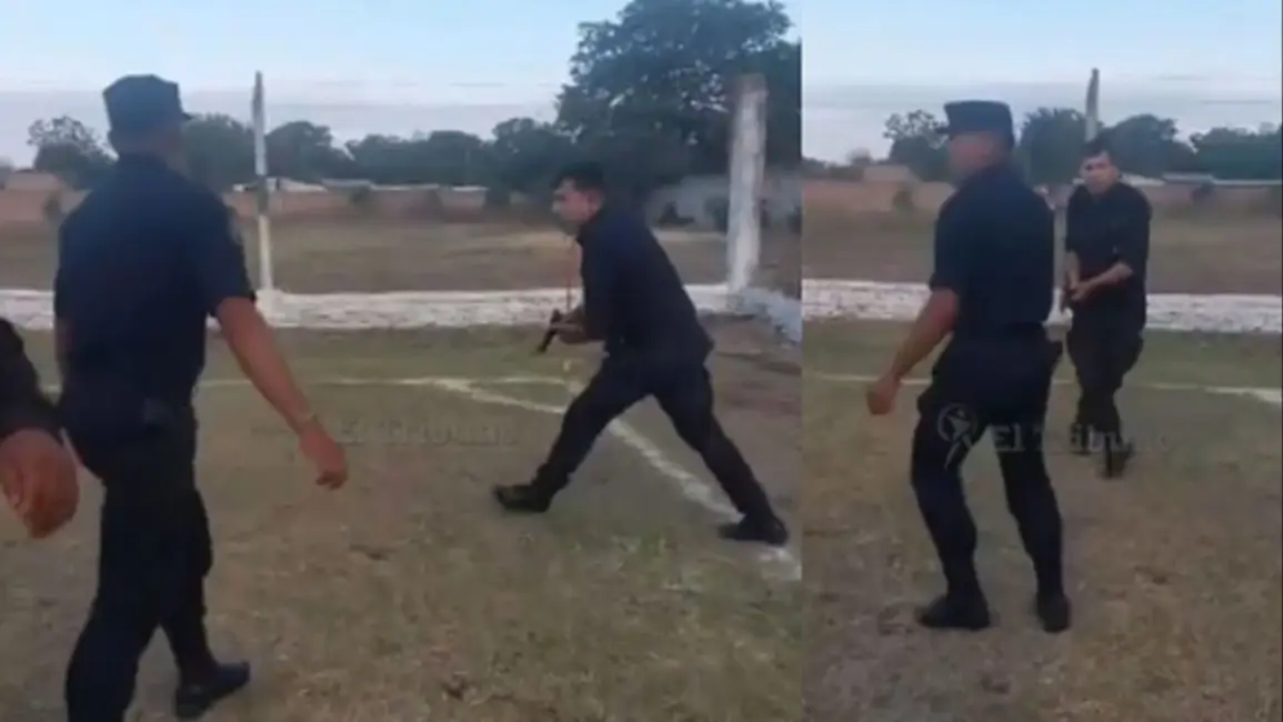 En el video, que circuló por redes sociales, se observa al uniformado en el campo de juego con el arma en la mano, apuntando hacia el suelo y hacia los costados, mientras intentaba contener a un grupo de jugadores que se le acercaba.