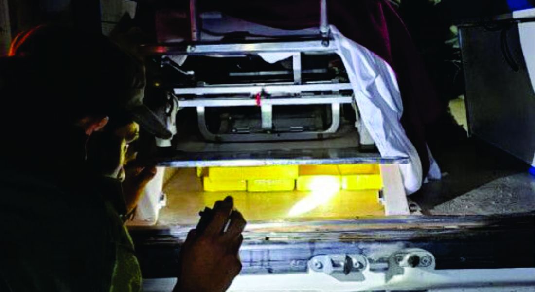 Los funcionarios visualizaron la presencia de tornillos que estaban removidos debajo de la camilla y el can antinarcóticos "Terra" marcó la posible presencia de estupefaciente. Inmediatamente, utilizaron destornilladores y hallaron un doble fondo que contenía paquetes rectangulares.